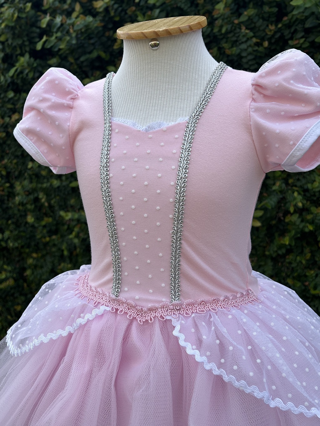 A parte de cima do vestido é confeccionada em algodão com elastano e a parte de baixo em tule (possui forro, o tule não fica em contato com a pele).